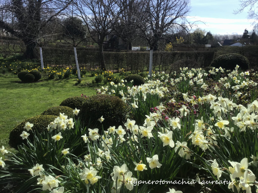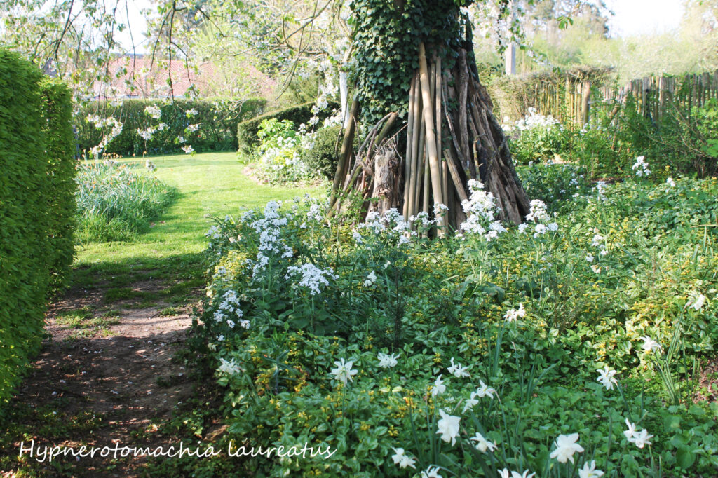 Deuxièmement, je vous encourage, aux endroits ombragés de votre jardin, de semer ou planter des floraisons blanches (Photo 2) dans l’objectif de réveiller l’ombre par contraste : ici, très précocement, les perces neiges  (galanthus nivalis) puis les narcisses blanches odorantes (Narcissus triandrus ‘Thalia’) planté en sous-bois sont suivi de la Monnaie du pape annuelle blanche (Lunaria annua). Cette dernière, étant bisannuelle, elle apporte un vrai effet surprise par sa sont développement soudain. En été et automne ses panicules de graines qui lui ont valu sa dénomination vernaculaire, perpétue le contraste ombre et lumière.