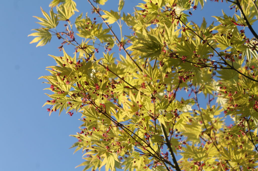 A l’inverse, les bulbes et floraison jaunes, au printemps, sont moins créateurs de fraicheur car la couleur jaune peu parfois être perçue, par l’œil, soit comme un blanc « salit » soit dans les verts. Mais, les floraison ou feuillages jaune vert, comme l’érable palmé japonais  (Acer palmatum ‘orange dream’) (photo 3) ou les Euphorbes (Euphorbia characias) réveillent les matins pluvieux…