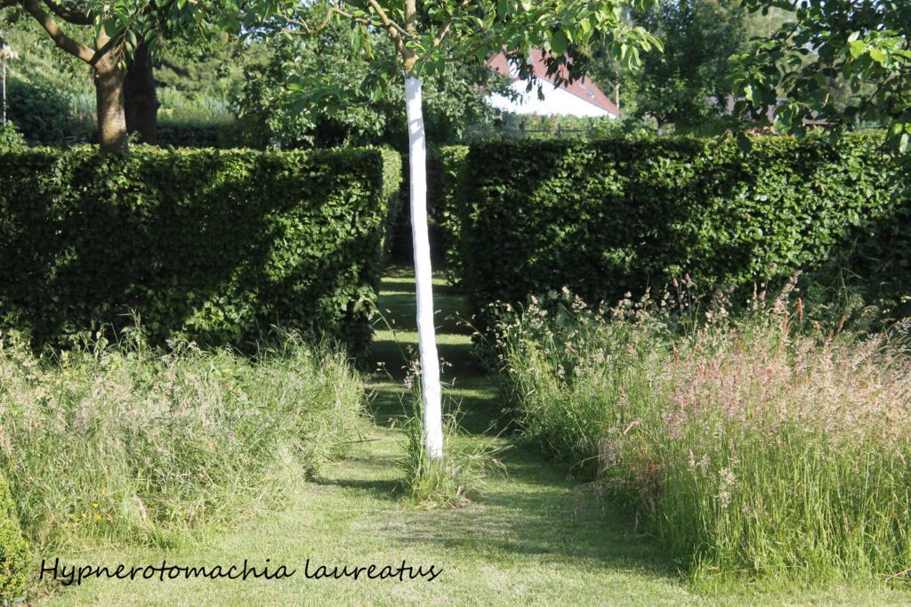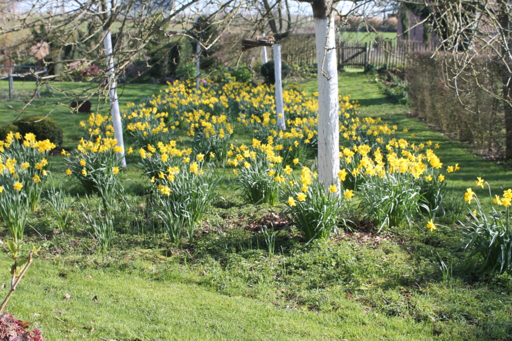 Quatrièmement, je vous encourage à apporter des éléments construit permanent blancs au jardin, par touches, sans surcharger l’espace d’un grand aplat qui monopoliserait l’œil. Comme par exemple, au jardin, j’ai choisi de révéler l’alignement des fruitiers en effectuant, chaque printemps, un chaulage des troncs (Photo 5). Cela ajoute un rythme, souligne la disposition en mail et de ce fait accentue la longueur et le vallonnement de cette partie vue depuis la maison. Ce formalisme blanc, contraste de plus, par sa touche contemporaine, avec l’aspect sauvage et naturel de la prairie de fauche.